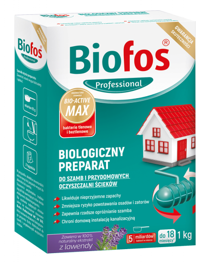Biofos Professional biologiczny preparat do szamb i przydomowych oczyszczalni ścieków posiada innowacyjną formułę Bio-Active Max ze składnikiem aktywnym biologicznie (probiotykiem), który działa kompleksowo wewnątrz domowego systemu instalacji sanitarnej, przyspieszając procesy rozkładu i upłynniania ścieków. Biologiczny preparat Biofos Professional zawiera zarówno szczepy bakterii tlenowych, jak i beztlenowych. Dzięki temu biologiczny preparat Biofos Professional działa w każdych warunkach.