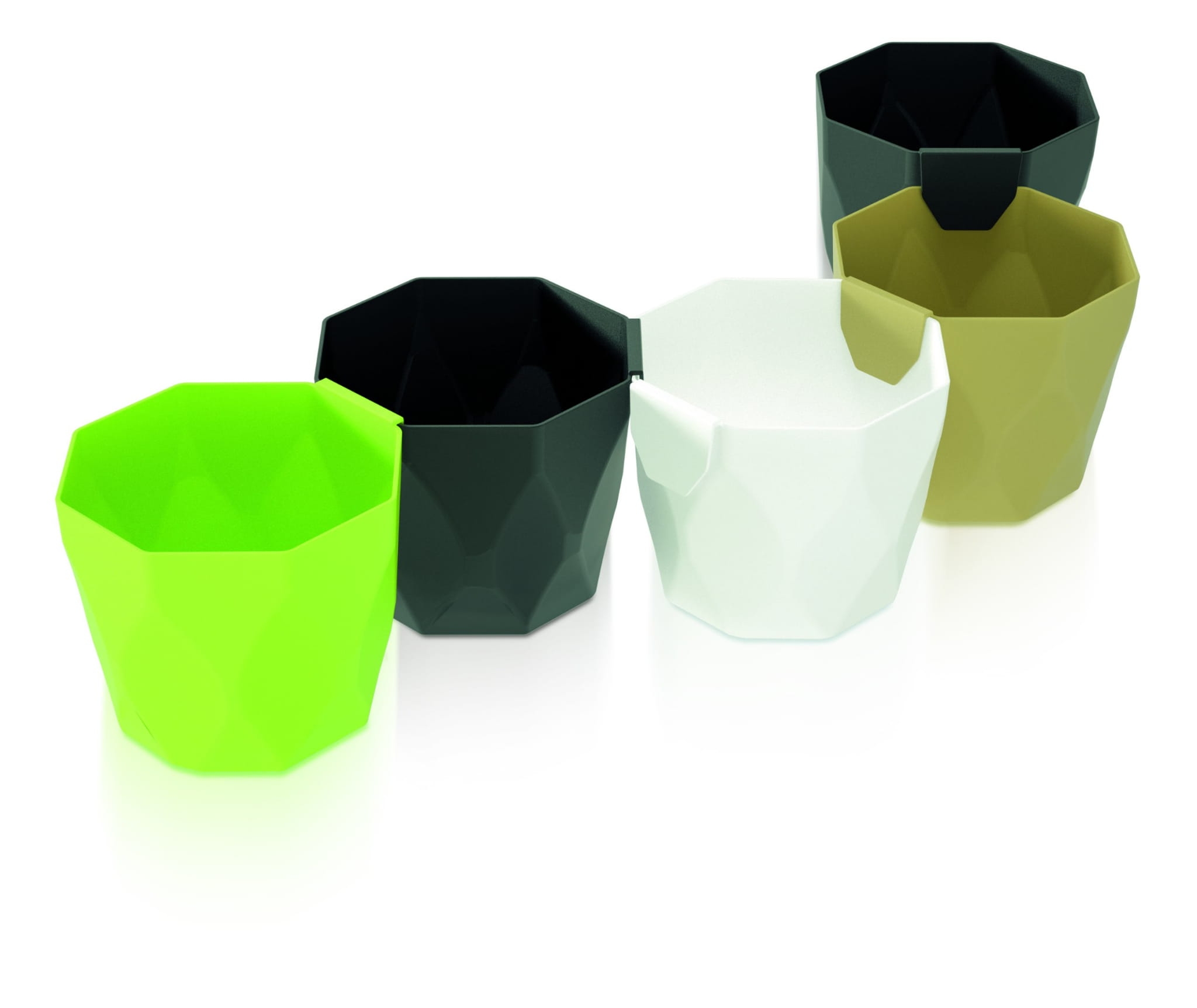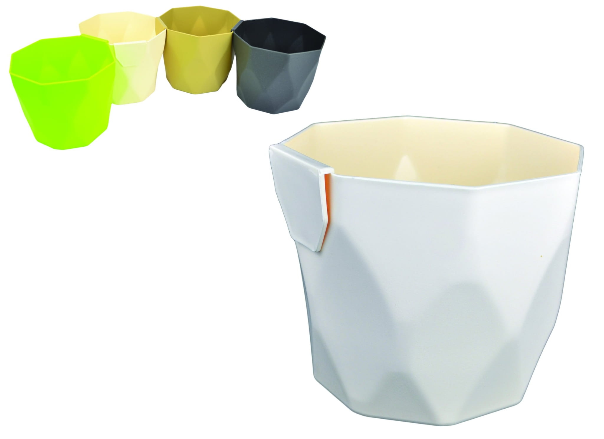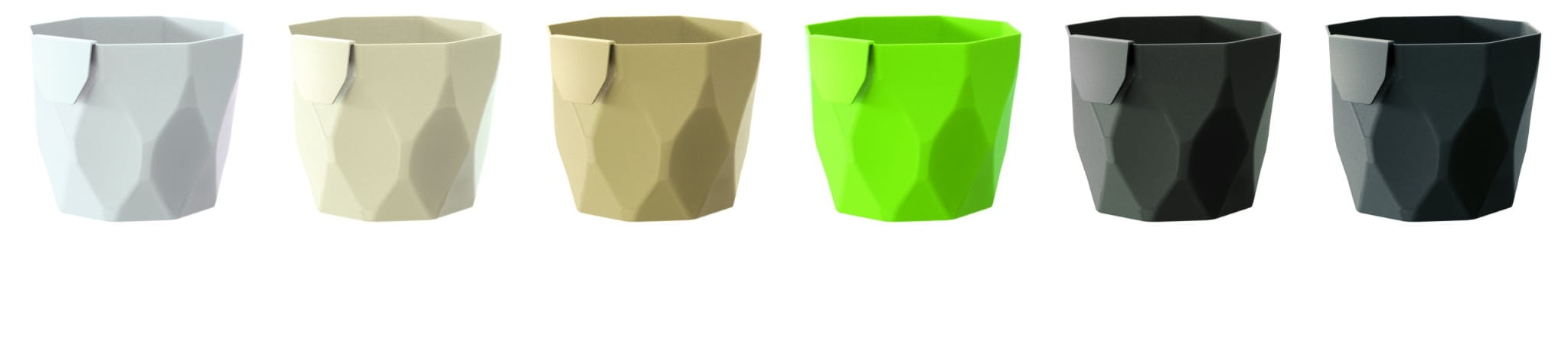 Doniczki z Rocka, można łączyć ze sobą za pomocą zintegrowanego "haczyka". Doniczki posiadają ciekawy przestrzenny wzór. Idealne na parapet, do ziół i małych kwiatów.
