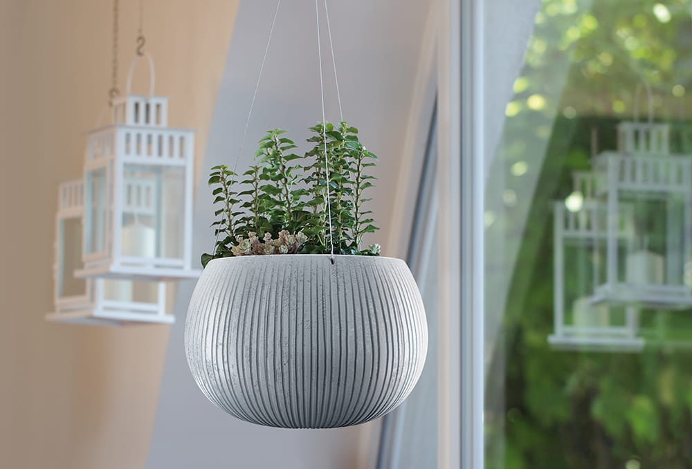 Wisząca, strukturalna doniczka z plastiku w kolorze szarości stanowiąca modną imitację betonu. Oryginalny model, idealny na balkon, taras czy do ogrodu.