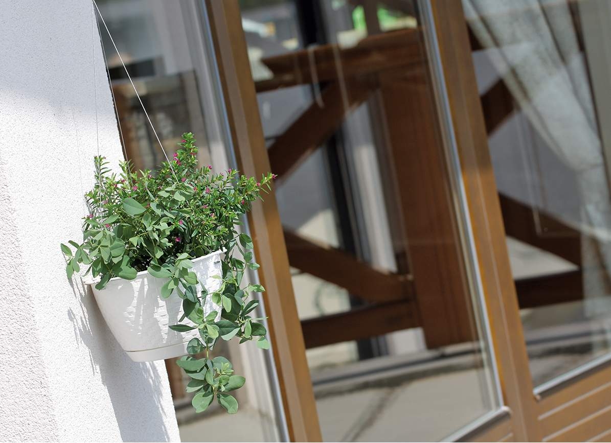 W skład zestawu wchodzą donica, plastikowy system podwieszania i podstawka z otworem pomocnym w podlewaniu.