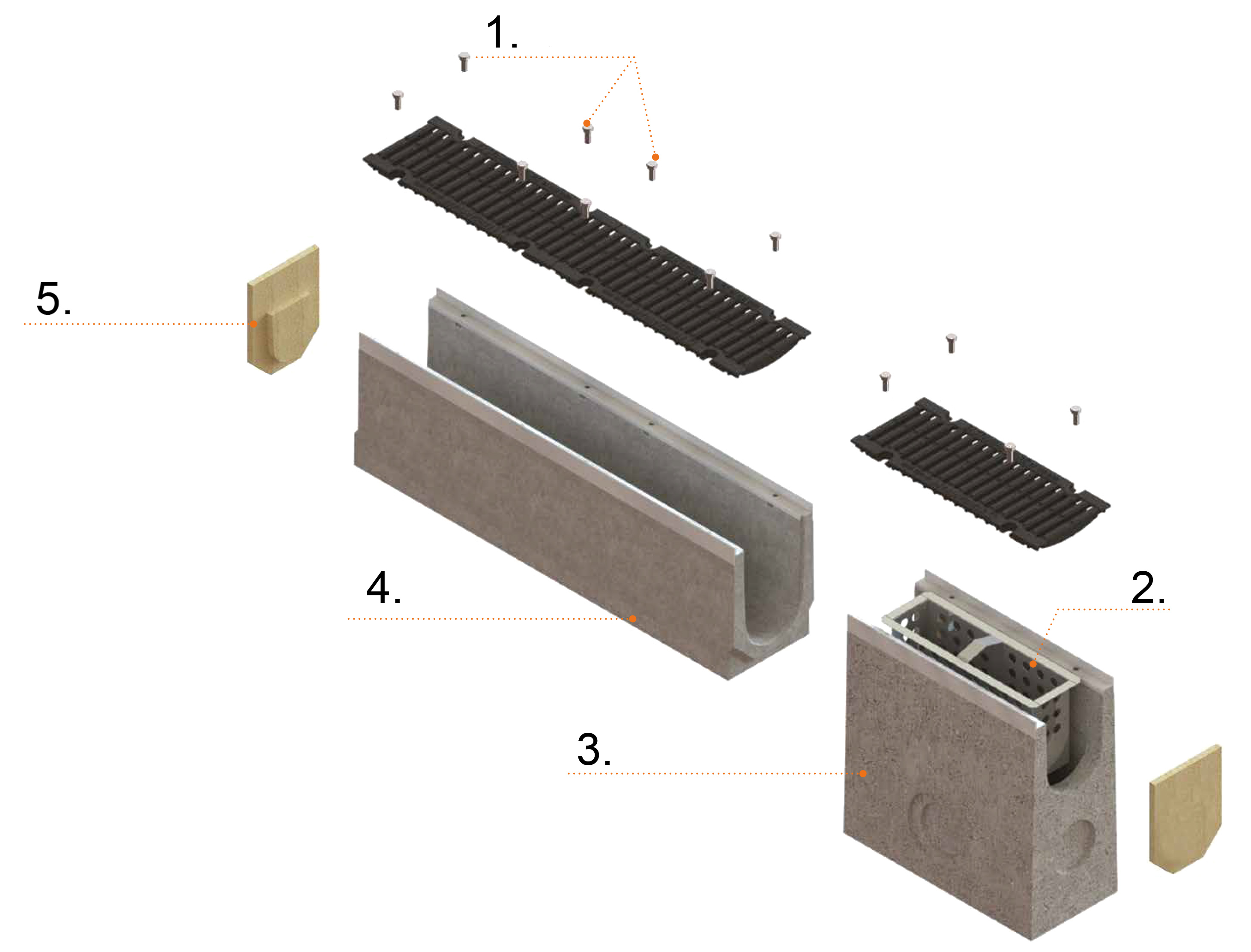 Korytka (kanały) betonowe z rusztem żeliwnym do wykonywania odpływów wody (odwodnień) dróg publicznych, wewnęrznych, parkingów, ogrodów, garaży, na przydomowych podjazdach i wszystkich innych miejscach gdzie występuję ciężki ruch kołowy. Tradycyjna betonowa wytrzymała konstrukcja zapewnia trawłość, bezproblemowy montaż i eksploatację