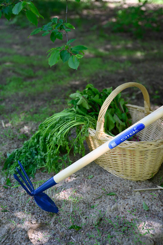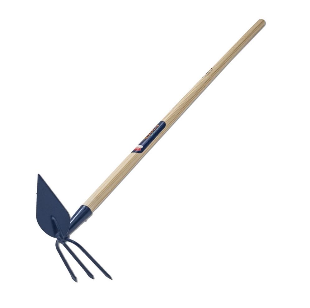 Welofunkcyjne narzędzie, ułatwiające pracę w ogrodzie, z jednej strony zakończona trójzębem, który spulchnia glebę, z drugiej głowicą w kształcie serca, która ułatwia usuwanie chwastów. Głowica wykonana z wysokiej jakości stali. Trzonek sosnowy, lakierowany.