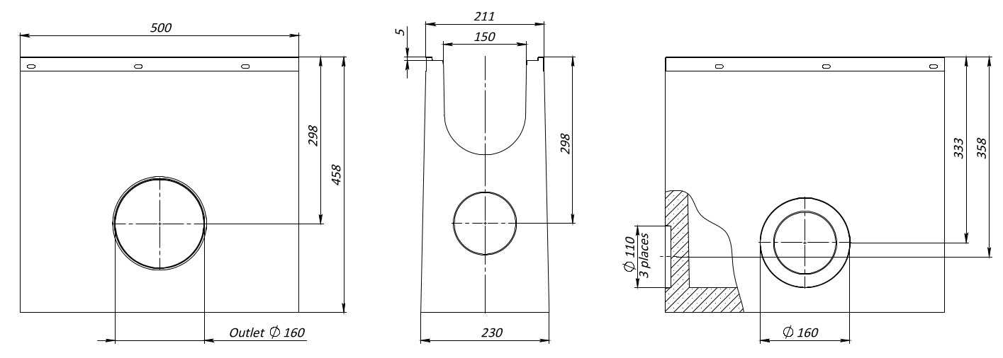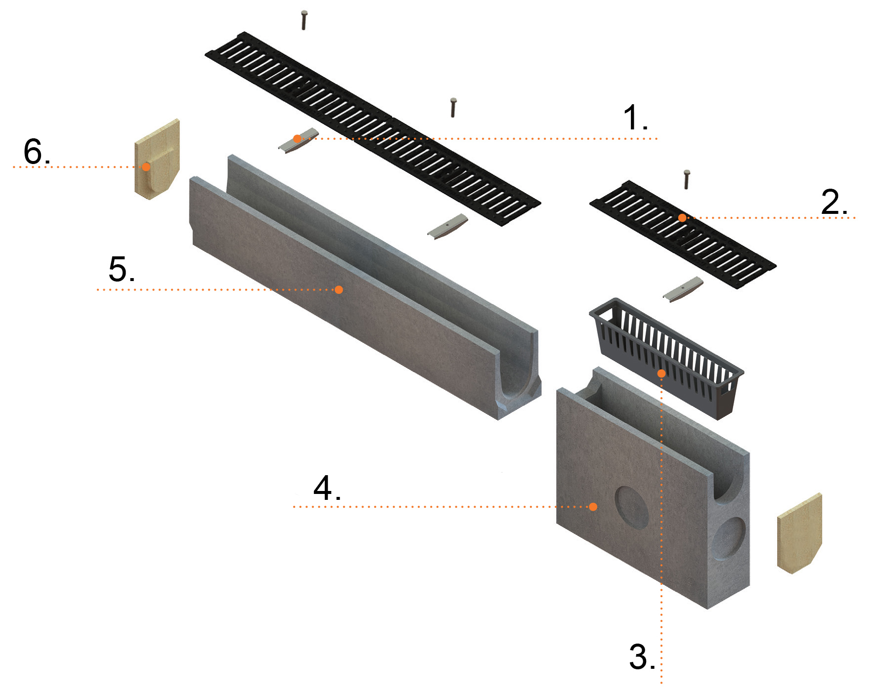 Oferta dotyczy jednej studzienki betonwej z wzmocnieniem krawędzi blachą ocynkowaną i rusztem żeliwnym. Do studzienki można podłączyć korytka (kanały) betonowe DN150. Odrowadzenie wody można wprowadzić z każdego boku. W zestawie sitko zbierające piasek.