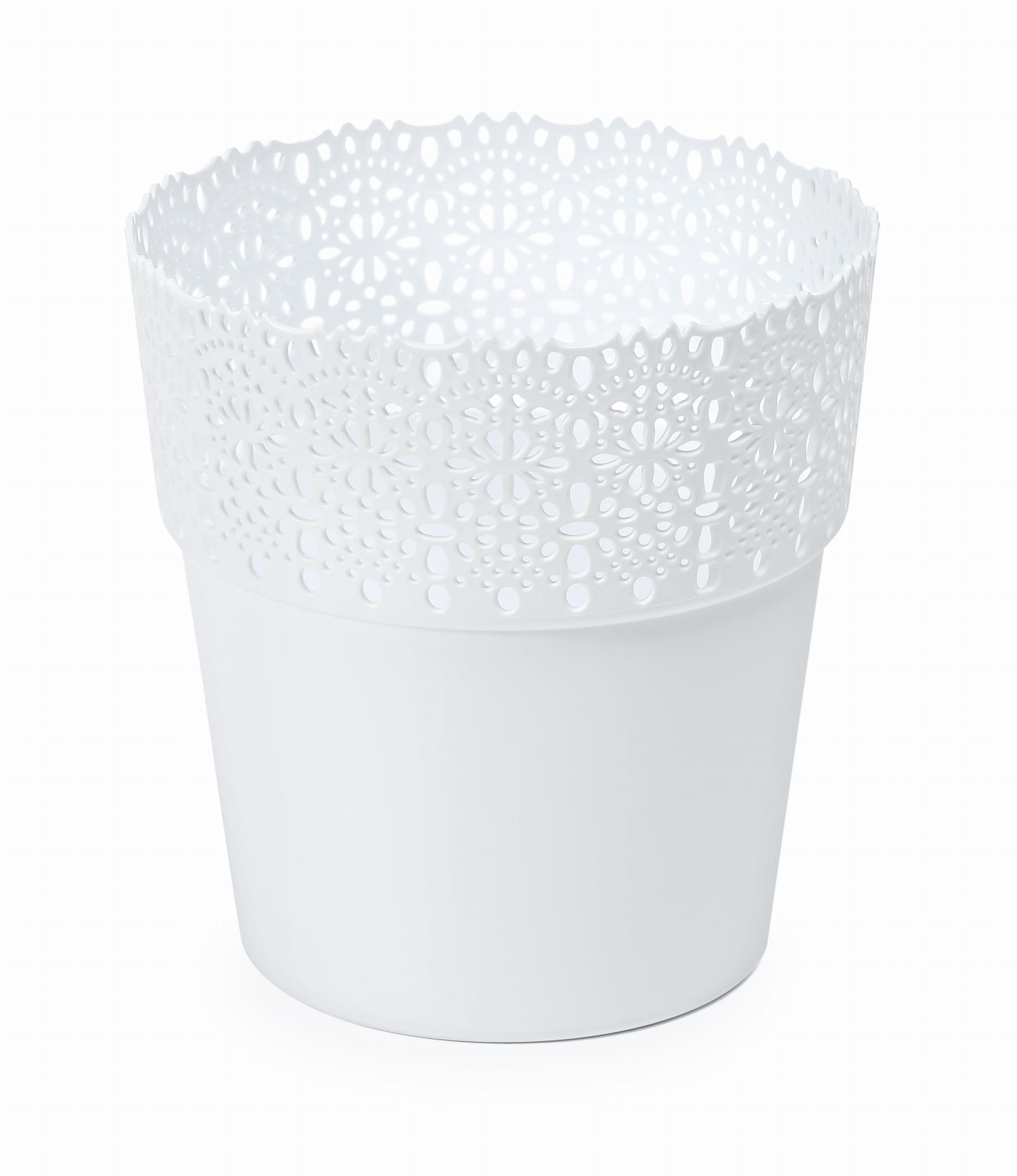 Elegancka doniczka osłonka wykończona wstawką imitującą wzór koronki, która dodaje jej klasycznego uroku i stylu. Doniczka ta będzie idealnym dodatkiem do wnętrz. Cechuję się tym, że jest wyjątkowo lekka, odporna na stłuczenia i łatwa w czyszczeniu - dzięki czemu Twoje rośliny zawsze będą prezentować się rewelacyjnie. Wykonana z wysokiej jakości tworzywa sztucznego przez polskiego producenta - firmę Lamela.